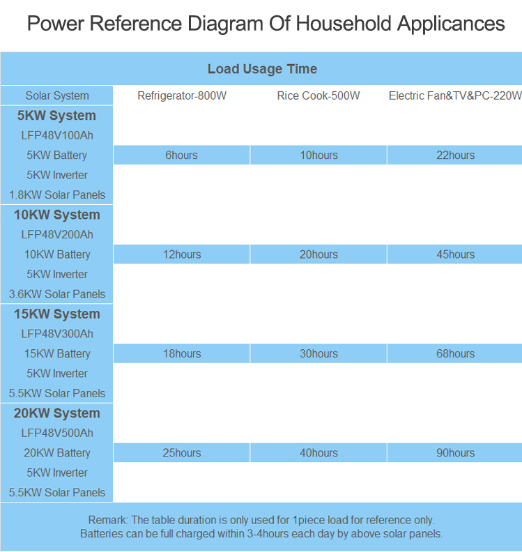 In addition to the roof area, the size of the solar power generation system is also determined according to its own electricity consumption. The return on investment can be maximized only when as much of the electricity generated by the system is directly used as possible. Whether you need to install an energy storage battery depends on your own electricity consumption. Therefore, before choosing a system, let the installation company give a reasonable system plan according to its own electricity consumption.You can view the electricity consumption information of common household appliances below.
