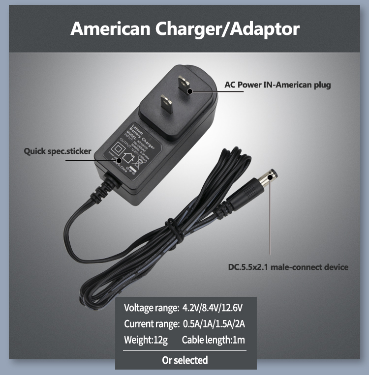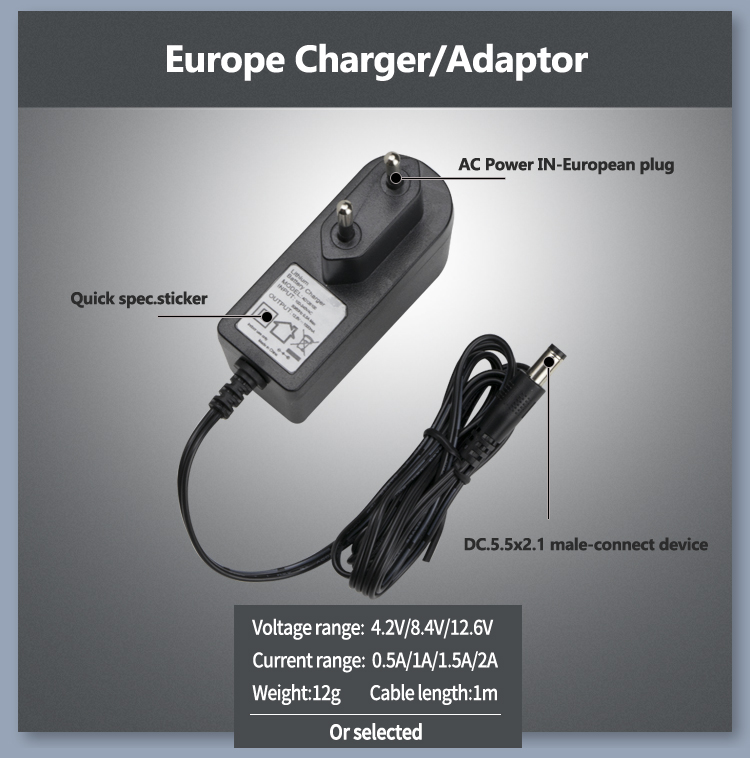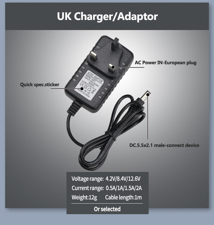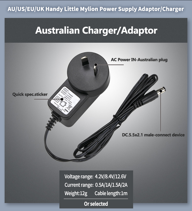 Be the first to review “Mylion CE certified 12.6v 1a AU,EU,UK,US adapter charger selected voltage and current 16.8v 14.8v 12v 8.4v 4.2v battery charger” Cancel reply