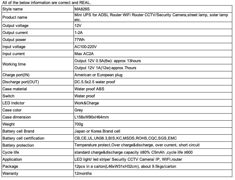Waterproof AC Power Mini DC UPS Battery Backup MA826S